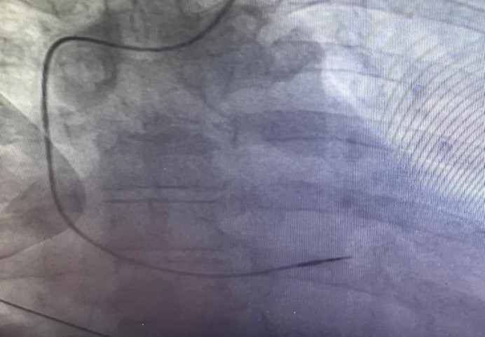 ECG at emergency department revealed loss of capture of pacemaker spikes [Figure 1]. Pacemaker interrogation showed complete loss of pacing and sensing of the ventricular lead. The patient admitted to any manipulation of the pace maker. Fluoroscopy revealed coiling of the pacing lead around the pulse generator [Figure 2]. The pacemaker pocket was reopened. Fortunately, both the insulation and the conductor of the lead were intact. The same lead was repositioned and proved to be functional with good pacing and sensing parameters [Figure 3]. The pulse generator was fixed on the pectoral muscle with non-absorbable sutures. No further complications were detected in one year follow-up.